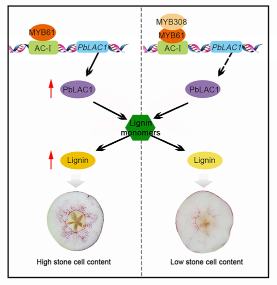通过瞬时过表达和基因沉默(VIGS)以及稳定转化苹果愈伤组织发现,PbMYB61可以促进木质素的生物合成,PbMYB308具有相反的作用。进一步的分子生物学实验结果表明PbMYB61通过与PbLAC1启动子中的AC元件结合上调表达来调节石细胞木质素的形成。然而,PbMYB308 通过与PbMYB61 结合形成不能激活PbLAC1 表达的二聚体来负调节石细胞木质素合成。