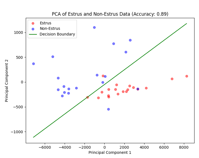 此外,研究团队还通过主成分分析(PCA)对奶牛行为数据进行了降维处理,成功区分了发情和非发情行为。通过结合极坐标变换和PCA,能够更精确地识别奶牛在发情期间的细微行为变化,如突然的方向改变和短促的移动。