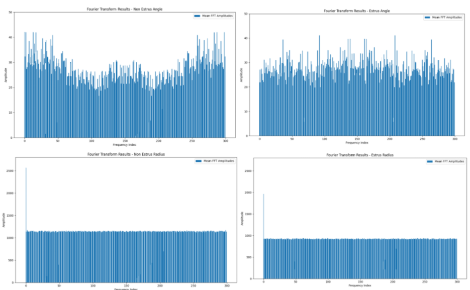 研究团队通过高精度坐标点重现技术,捕捉了奶牛在发情期间的细微动作变化。通过傅里叶变换分析,研究团队发现发情期间奶牛的行为频率分布更加复杂且多样化,而非发情期间则表现出较高的规律性和重复性。这一发现为发情检测提供了重要的行为特征依据。